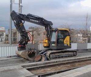 Une pelle compacte Volvo ECR145EL sur chenilles, équipée d’un godet de terrassement et d’un tiltrotateur pour une grande polyvalence sur les chantiers urbains et les travaux de terrassement précis.